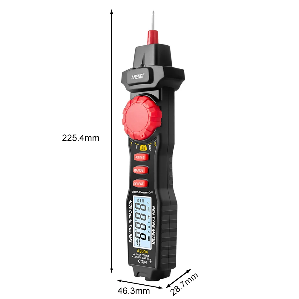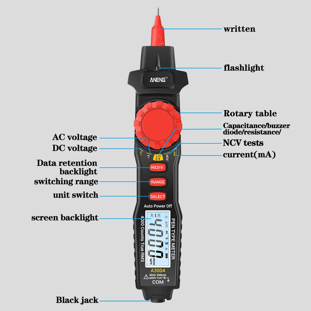ANENG A3004 Цифровой мультиметр Тип ручки подсветка LCD 4000 отсчетов автоматический тестер диапазона AC DC Амперметр Напряжение сопротивление емкость диод измеритель непрерывностиХарактеристика:1. Это мультиметр типа ручки с высокой надежностью, высокой точностью и легко носить с собой.2. Многофункциональность: может точно измерять напряжение переменного и постоянного тока, ток, емкость и сопротивление.3. ЖК-экран с подсветкой, удобно считывать данные в темноте.4. Автоматический диапазон, автоматическое выключение, диодный тест, Бесконтактное Обнаружение напряжения.5. Широкий спектр применения: это идеальный инструмент для лабораторий, фабрик и семей.Спецификация:Материал: АБС-пластикРазмер: 225,4*46,3*28,7 мм/8,87*1,82*1,13"Цвет: черныйИсточник питания: 2 * AAA батареи (не входят в комплект)Функция зуммера: ДаМаксимальный ЖК-дисплей: ДаАвтоматическое выключение: ДаМаксимальный дисплей: 4000 отсчетовТочность диапазонаНапряжение постоянного тока 400мв ± (0.8% + 5)4 в/40 В/400 В ± (0.8% + 3)600 В ±(1% + 3)Напряжение переменного тока 4 в/40 В/400 В ± (1% + 3)600 В ±(1.2% + 5)Ток постоянного тока 40мА/200мА ±(1% + 3)Переменный ток 40мА/200мА ± (1.2% + 5)Постоянной ёмкости, универсальный конденсатор 4nF/40нф/400нф/4 мкФ/40 мкФ/400 мкФ ± (3% + 5)4мф ±(5% + 10)Сопротивление 400Ω/4k Ω/40k Ω/400k Ω/4MΩ ± (1.0% + 5)40MΩ ± (1.2% + 8)Примечание:1. Возможны незначительные отклонения в размере из-за ручного измерения, различных методов измерения и инструментов.2. Изображение может не отражать фактический цвет изделия из-за различных фотографирования светильник, угол и дисплей монитора.![]()