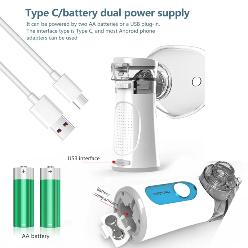 2. Батарея или USB зарядка: он может питаться от 2 батареек АА (не входят в комплект), или непосредственно от подключаемого адаптера с usb-кабелем (кабель входит в комплект). Он имеет светодиодные фонари для индикации работы. Это полностью Профессиональный Ингалятор, который вам нужен для максимальной выгоды и простоты использования.