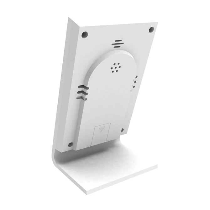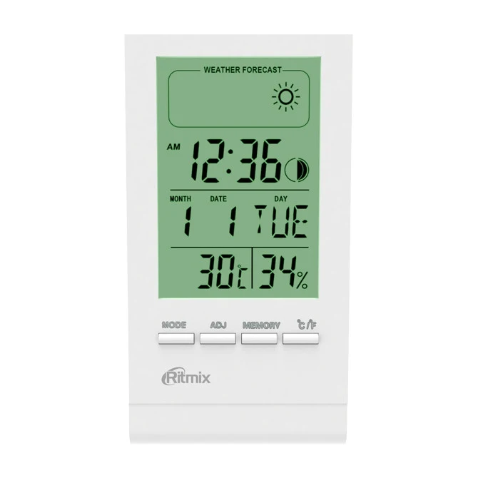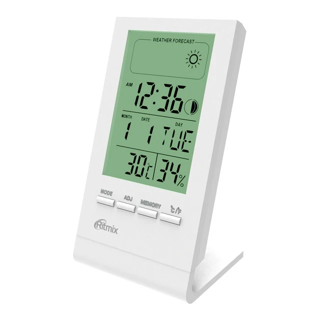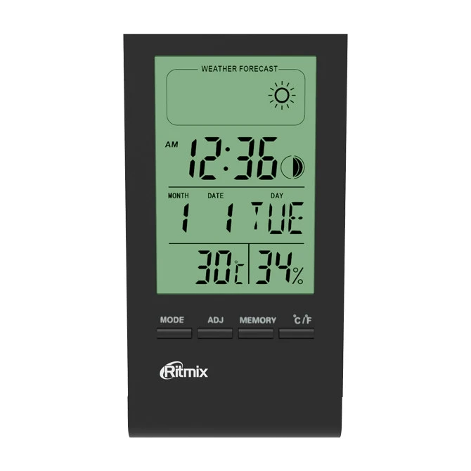С термометром (от -50 до 70°C), гигрометром (от 10 до 99 %), часами-будильником и индикацией комфортной погоды и фазы луны, в тонком корпусе со съёмной подставкой. Размеры 96 х58 х15 мм.