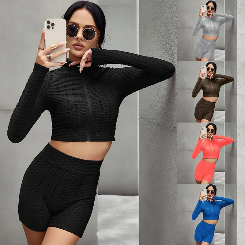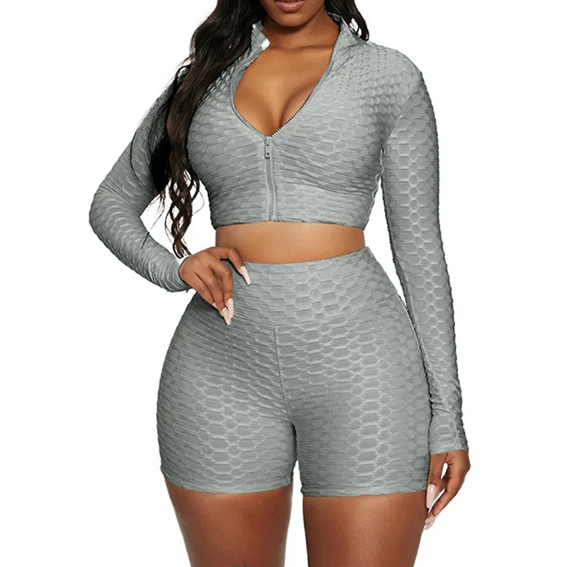 Летний спортивный женский комплект из 2 предметов, спортивная одежда, леггинсы для фитнеса, укороченный топ с длинными рукавами, пальто на молнии, шорты, комплект, спортивные костюмы