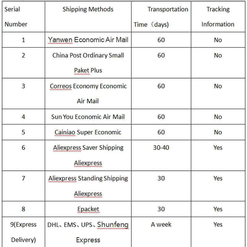 1. После того как вы разместите заказ, мы отправим товар немедленно, если мы не в наличии, но отправим в течение 3 дней. Мы отдыхаем в воскресенье, и доставка будет в понедельник утром.