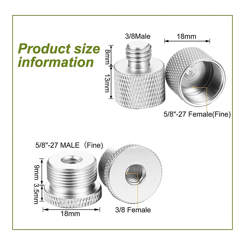 Хорошие аксессуары: если у вас есть какая-то подставка для микрофона или стрела, которая имеет небольшой винт, но у вашего микрофона есть большой винт, этот набор адаптеров доступен для вас; конвертация держателей микрофона и аксессуаров от 5/8 дюймовых нитей до 3/8 или 3/8 дюймовых штекеров до 5/8 дюймовых розеток