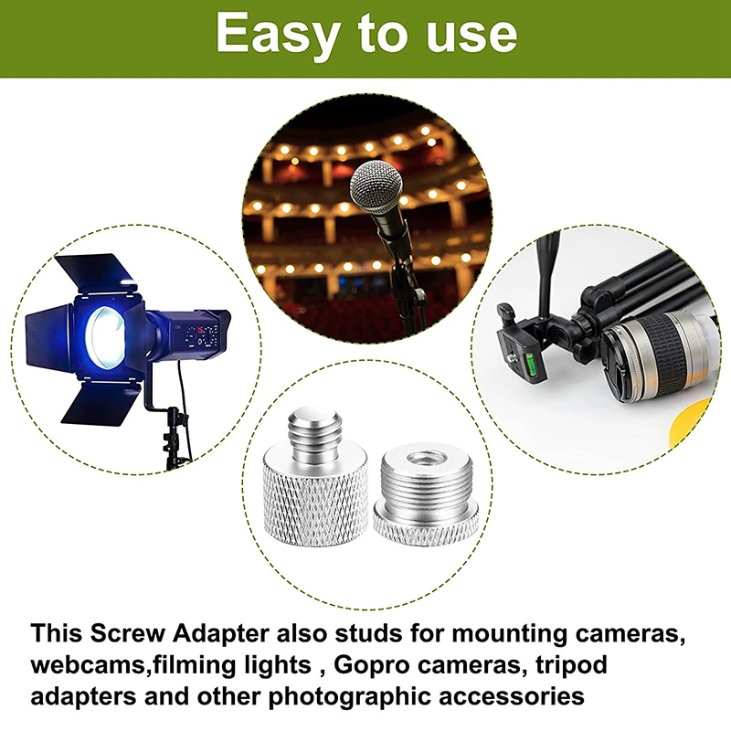 Широко используется: 3/8 дюйма Штекерный до 5/8 дюйма Женский адаптер с микрофоном хорошо работает со стандартными микрофоном стендами и микрофонами/микрофонами с европейскими резьбовыми вставками 3/8 дюйма; А также шпильками для монтажных камер, веб-камер, освещение для съемок, регистраторы, экшн-камеры, адаптеры для штатива и другие фотографические аксессуары на подставке для микрофона