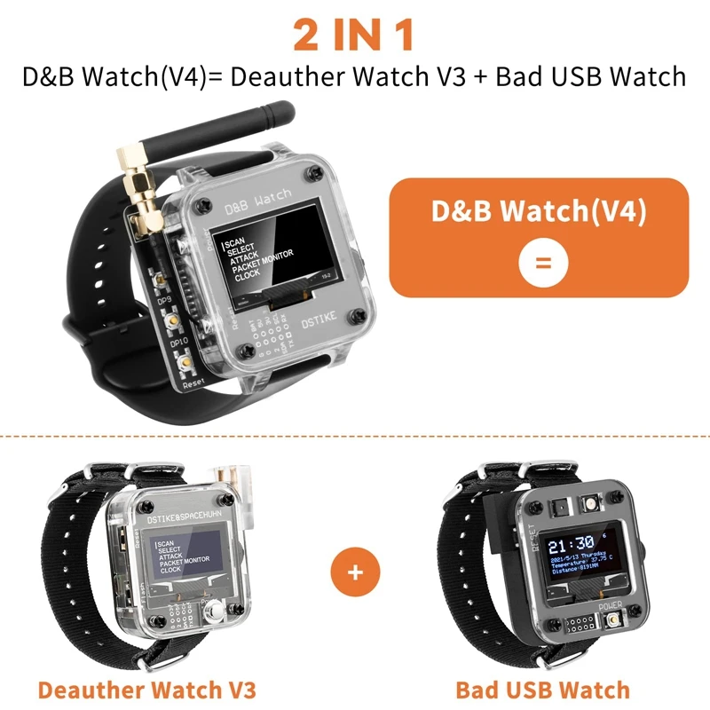[Deauther watch V4-больше и мощнее] обновленные часы deauther watch V4, это часы D & B, которые являются Deauther & Bad USB watch, теперь эти часы V4 могут не только отключать wifi, но и выполнять плохую атаку usb; С внешней антенной 3 дБ он может искать больше сигнала, чем V3, Также можно добавить большую антенну к разъему SMA; Обратитесь к нашим часам Deauther V3, чтобы понять, что такое deauther