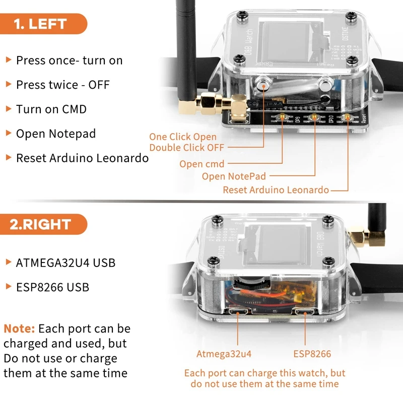 [Улучшенная емкость батареи-от 800 до 1000 мАч] по сравнению с Deauther watch V3, эти deauther и bad usb watch V4 были модернизированы емкость аккумулятора от 800 мА · ч до 1000 мА · ч, которая будет иметь более длительный срок службы батареи, и веселье прослужит дольше; Примечание: на часах есть два usb-порта, И каждый может использоваться для зарядки аккумулятора, но не рекомендуется использовать их одновременно