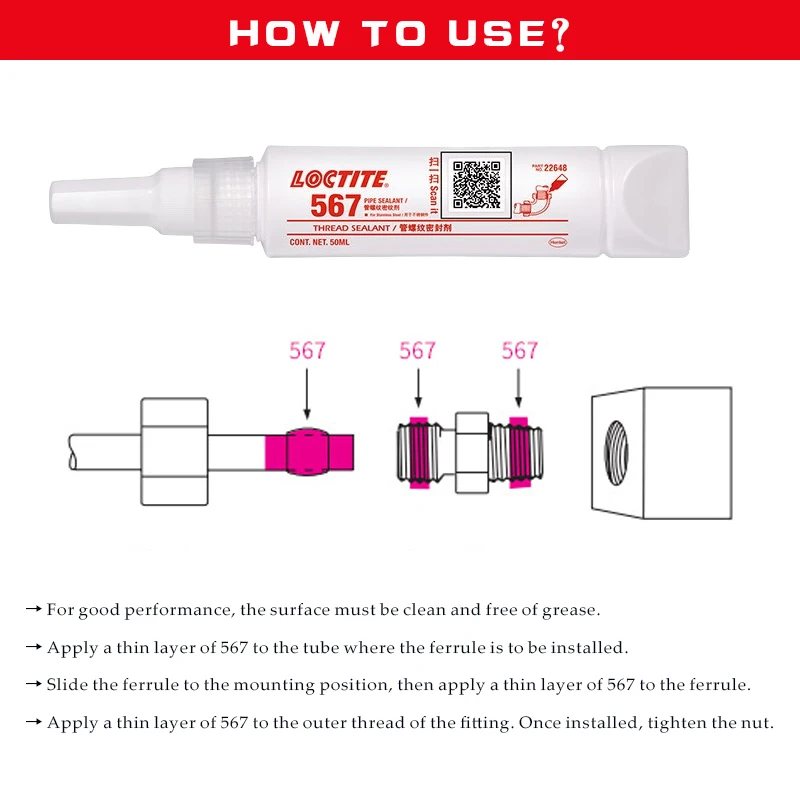 Main application: used for sealing metal threaded fittings, slow curing performance makes the sealing parts have more time to assemble, it is suggested that the fittings should be tightened when sealing.