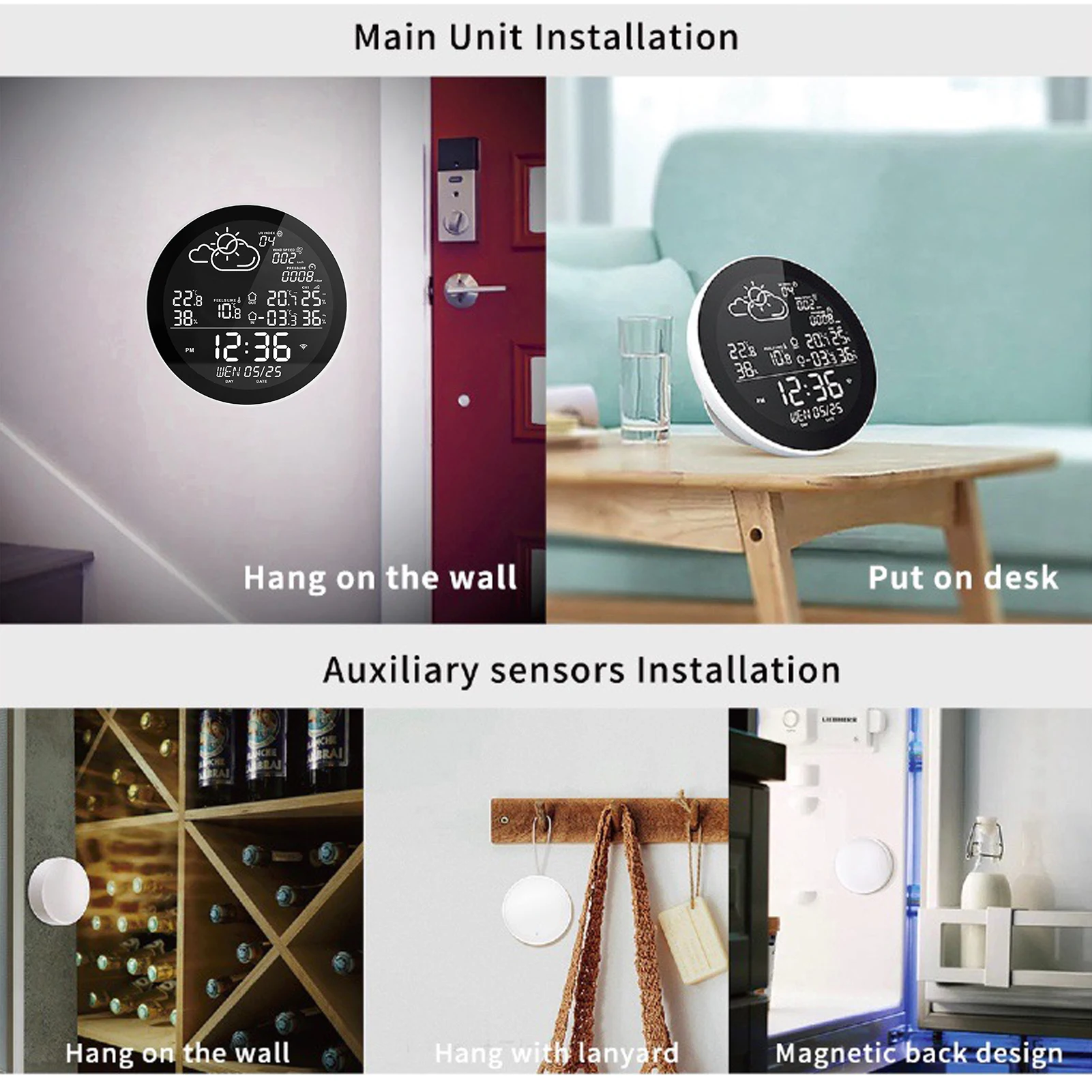 Часы метеостанции можно повесить на стену или поставить на стол, легко установить.