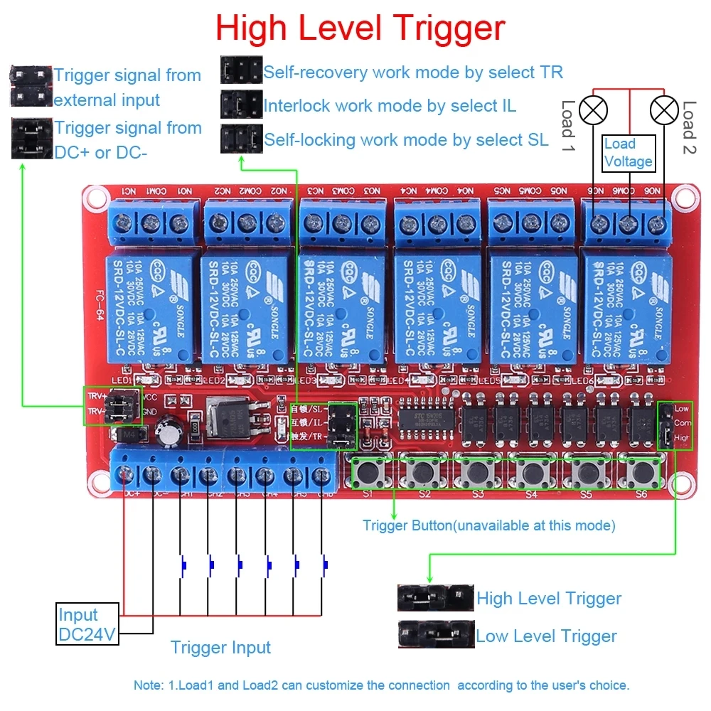 6-канальный релейный модуль постоянного тока 12 В реле высокого/низкого уровня