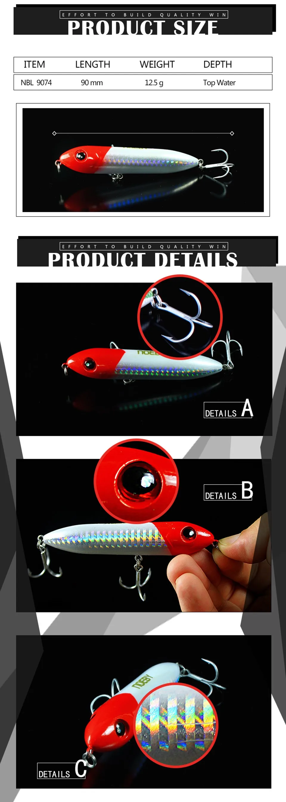 1.3D глаза 2. Крючок: французский VMC крюк 3. Материал: АБС-пластик 4. OEM: Доступен 5. Упаковка: ПВХ пластиковая коробка + вставная карта 6. Длина: 90 мм 7. Вес: 12,5 гОсобенности: