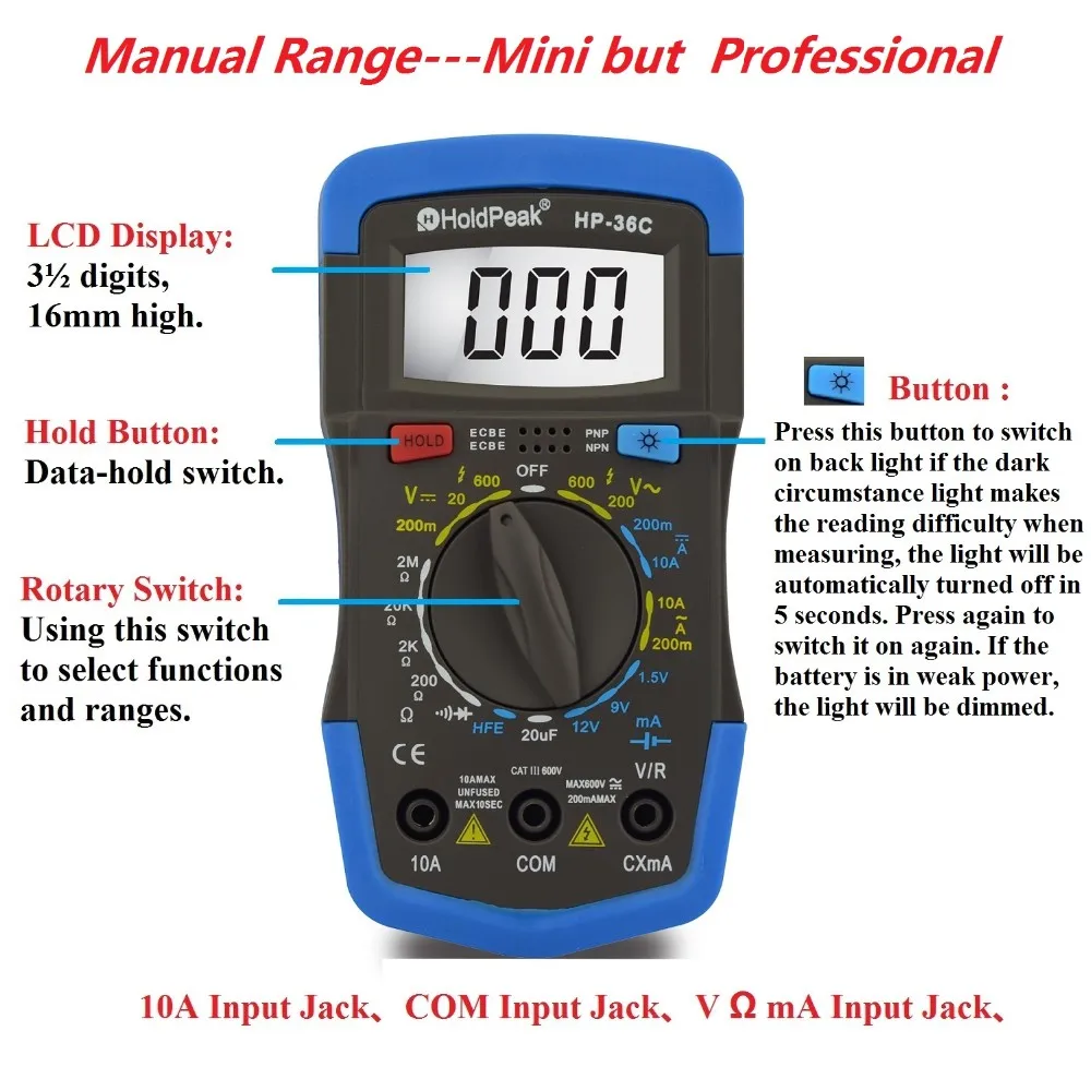 Наименование товара: Цифровой мультиметр HoldPeak HP-36C Бренд: HoldPeak Производитель: ZHUHAI JIDA инструмент HUAPU CO., LTD. Основная функция: Ручной диапазон Тест напряжения постоянного/переменного тока Тест постоянного/переменного тока Тест на сопротивление/Емкость Диод/hFE Тест Непрерывный зуммер Задний светильник Хранение данных Тест батареи