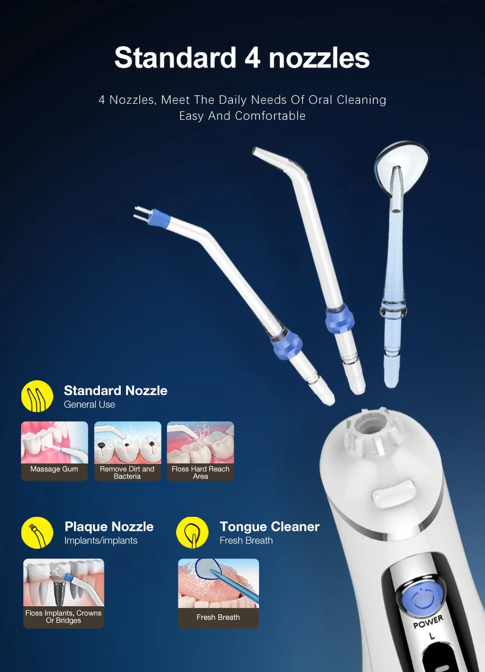 Особенности: Напряжение: 4,5 V Давление воды: 70 ~ 110 фунтов/кв. дюйм Емкость: 240 мл Насадки: 4 шт. Посылка включает в себя: 1 x ирригатор для полости рта 4 шт. Зарядное устройство-1 шт.; Для аккумулятора (1 шт.) 1 x сумка