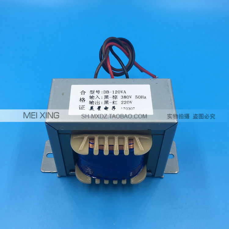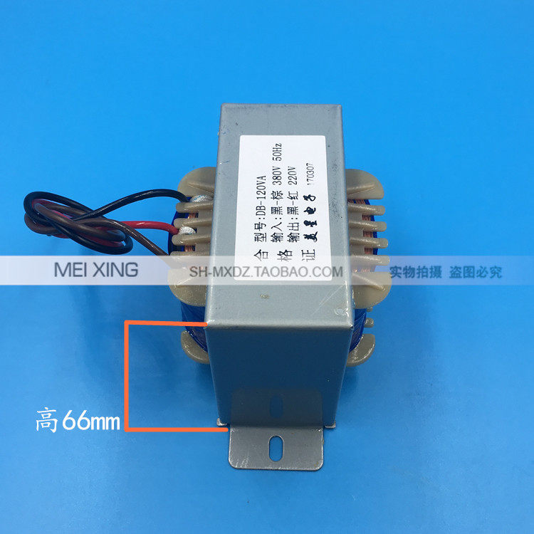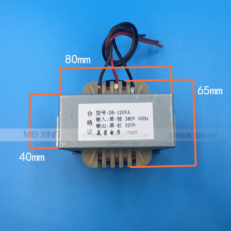 Rated power: 120VA Input voltage: AC380V ~ 50Hz (black brown) Output voltage: AC220V (black - red) Iron core shape; EI type Coil material: copper structure: single phase self coupling transformer. Appearance size: 80*65*66mm Installation hole: 92mm Input line length: default 15 cm Output line length: default 15 cm