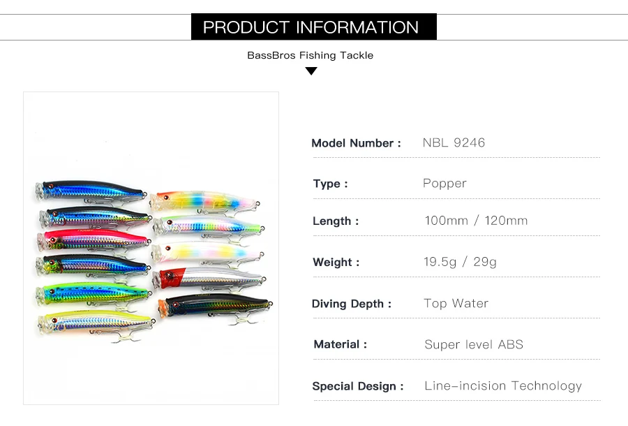 Модель: NBL 9246 Тип: Поппер Длина (мм): 100/120 Длина (дюймы): 3,937 дюймов/4,7 дюймов Вес (г): 19,5g/29 гр Вес (унции): 0,69 унций/1,0 унций : Материал подошвы: полиуретан толщина Топ воды Материал: супер уровень абс Специальный дизайн: линия-технология разреза