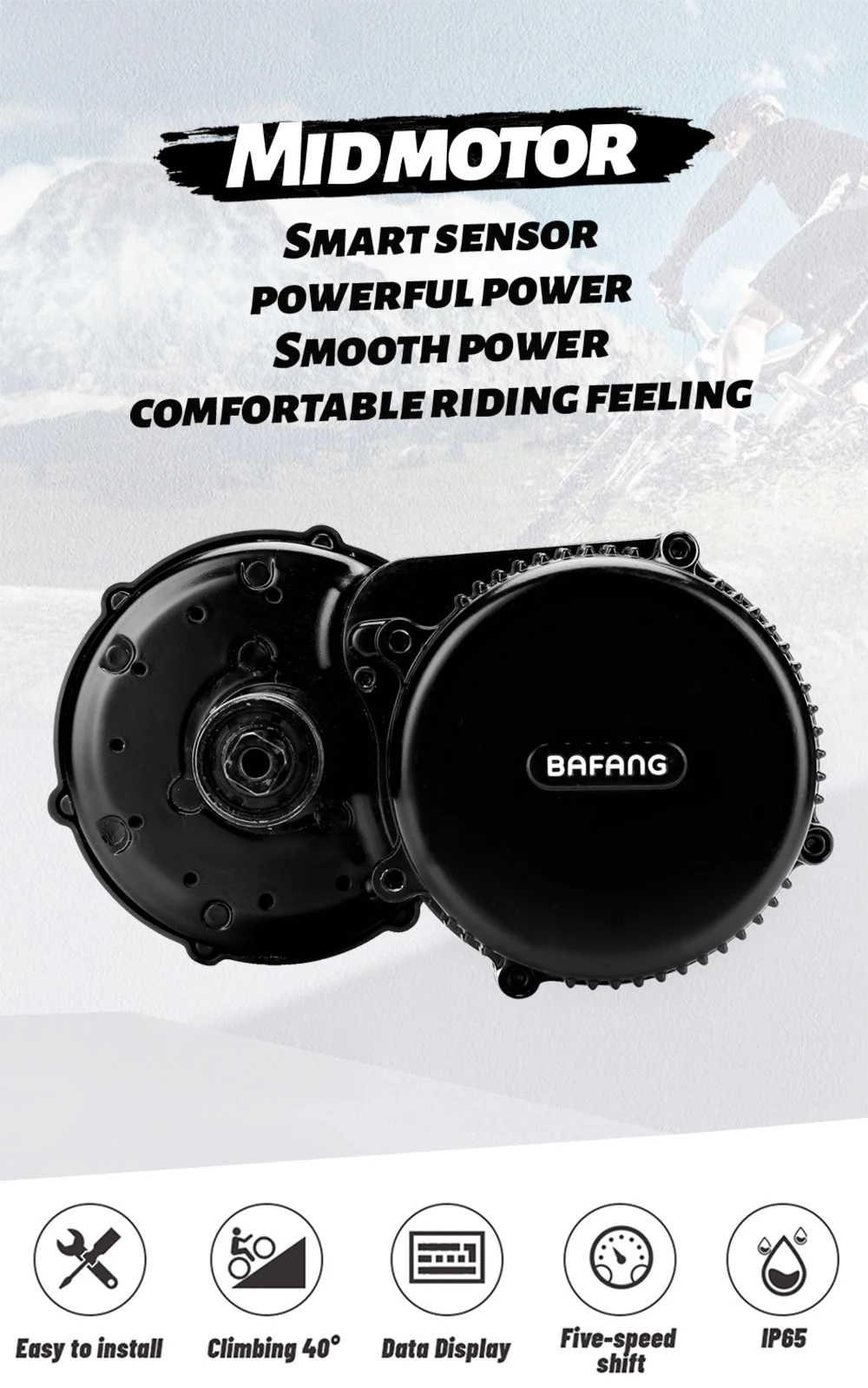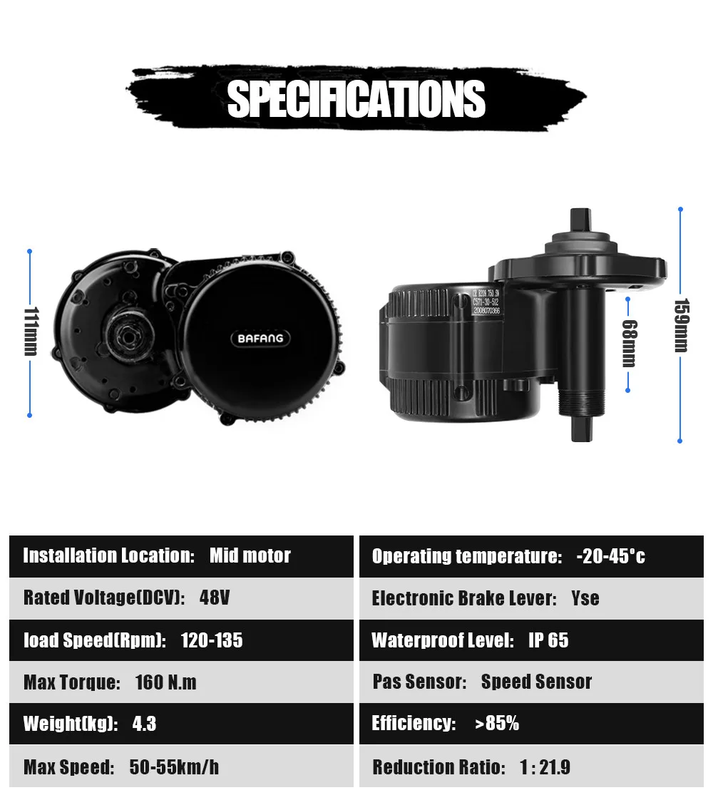 Со встроенным датчиком скорости, этот двигатель среднего привода, который совместим с нижним кронштейном 68-73 мм, имеет номинальную мощность 750 Вт, коэффициент уменьшения 1: 21,9 и максимальный крутящий момент 160 Н. М, обеспечит всадника большой взрывной силой при запуске системы. Очень сильный и эффективный, этот двигатель значительно увеличивает радость езды и подходит для горных велосипедов и песочных велосипедов, которые являются фаворитами гонщиков, которые любят вызовы, а также транспортных велосипедов. Этот двигатель черный.