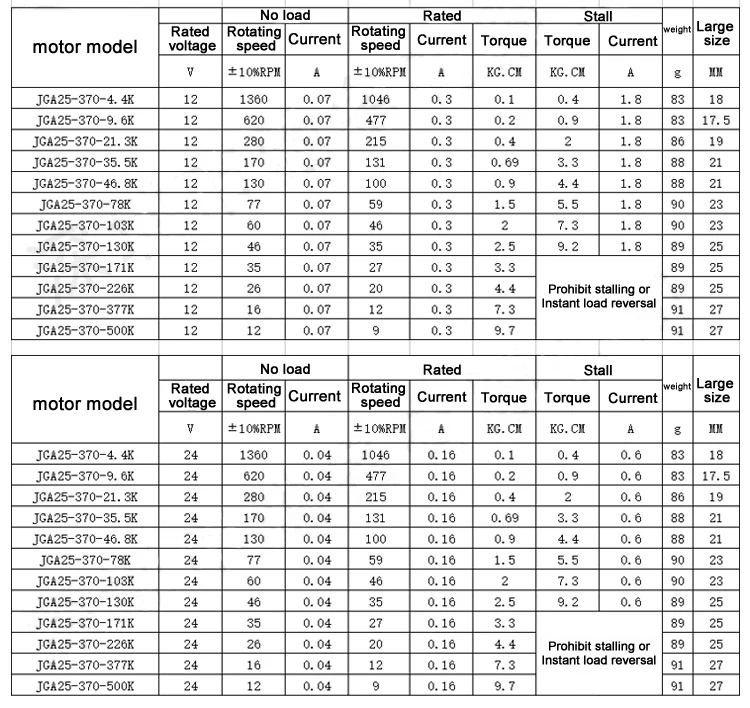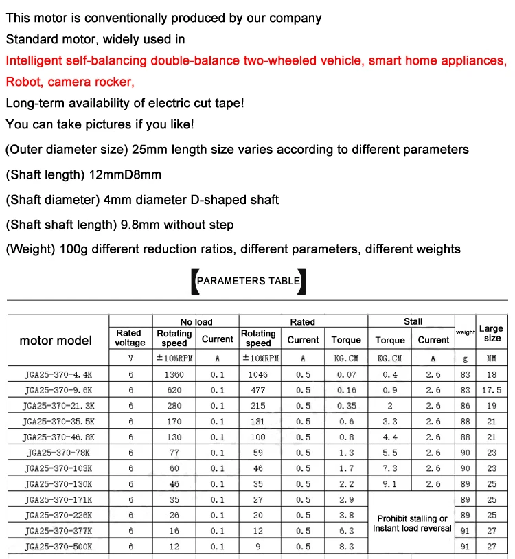1) перед покупкой, у нас есть напоминание, пожалуйста, внимательно проверьте следующую таблицу параметров, вы можете увидетьНоминальный крутящий момент нагрузкиИКрутящий момент стойла, Если вы выбираете одну из скоростей, нагрузка вашего проектаНе может превышать номинальный крутящий момент, В противном случае ток двигателя увеличится, рабочая температура двигателя увеличивается, через некоторое время Шестерня будет изношена, линия будет сломана, двигатель будет поврежден, не может продолжать работать.