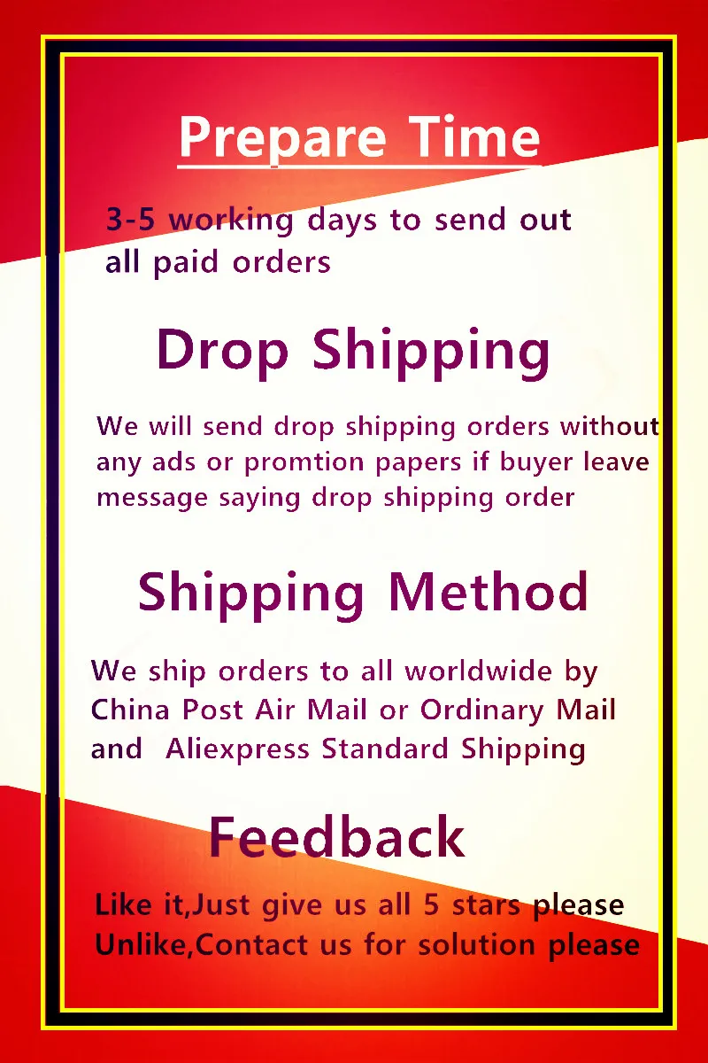 Payment 1.AliExpress supports Visa, MasterCard,Maestro Debit Card, Western Union, Webmoney, QIWI and wire Transfer via banks.2.If you still have any questions on the payment, Feel free to contact us. Shipping1.We will send the items within 2-3 days once system confirms buyers payment.2.We will refund buyers if buyers return the items within 15 days of buyers receipt of the items for any reason. However, the buyers should bear the returnshipping freight and make sure that the items returned are in their original conditions.3.Items are shipped by Ali Express Standard Shipping , Ali Express Premium Shipping, e Packet, reach most of countries within 15 to 35 business days.Delivery time depends on destination and other factors, it may take up to 60 business days |