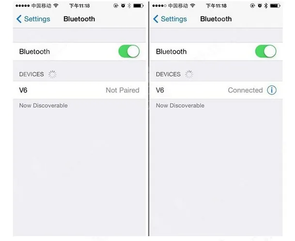 Включите bluetooth на свой мобильный телефон, когда вы увидите «V6», нажмите на него, чтобы подключить.