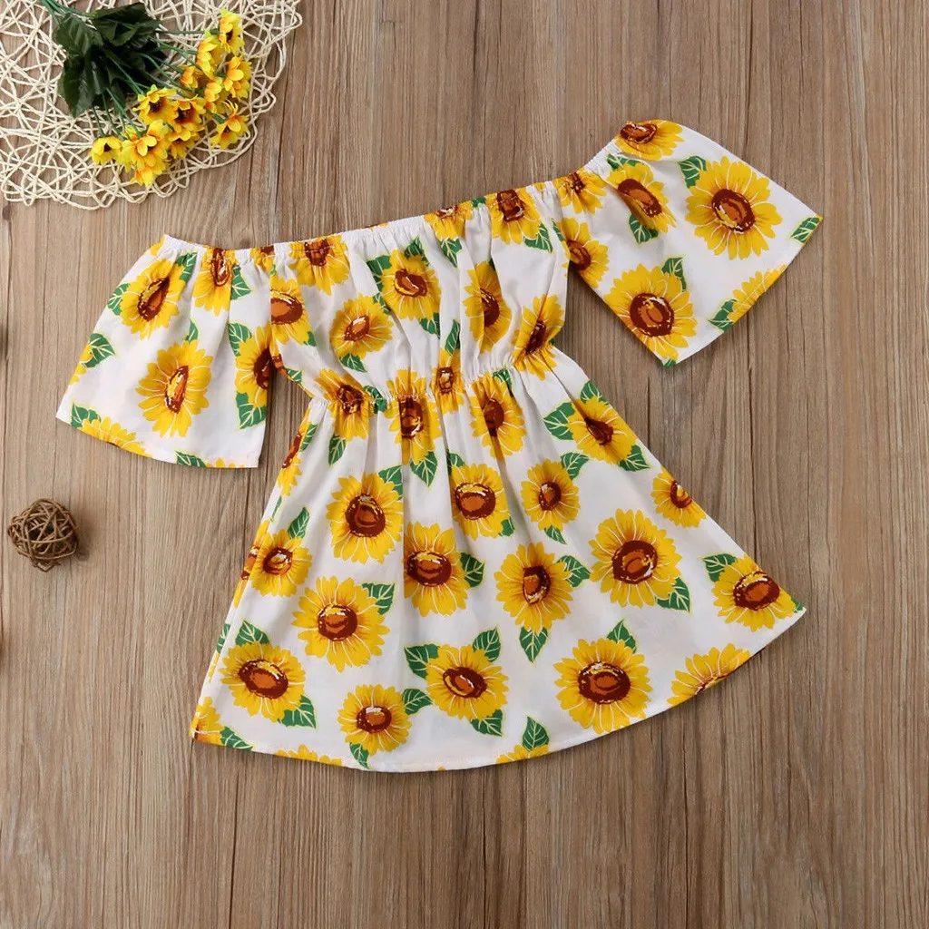 Children Kids Baby Girls Sleeveless Off Shoulder Sunflower Print Floral Dress