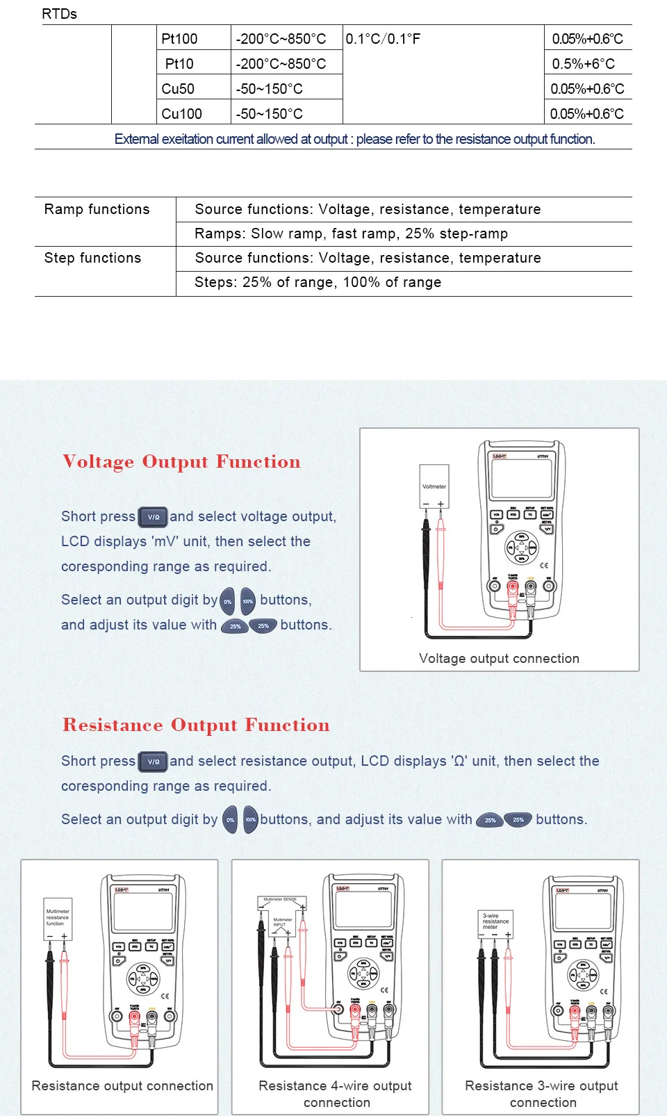 3 функции выхода: напряжение постоянного тока, сопротивление, термопары и термостойкость