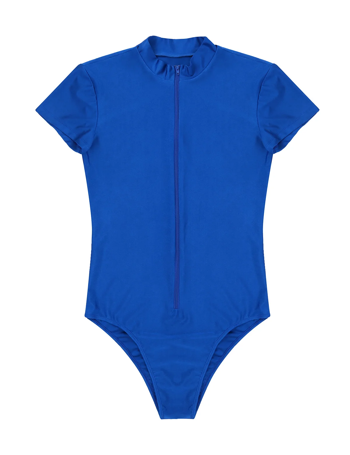 Круглый вырез, короткие рукава, высокий крой, сплошной цвет, застежка-молния спереди.