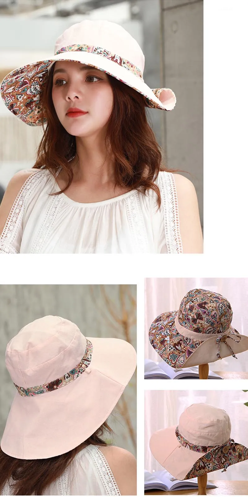 Одна шляпа, два способа ношения, хлопчатобумажная лента, бант, женские весенне-летние солнцезащитные шляпы для взрослых, повседневные складные женские пляжные кепки с широкими полями