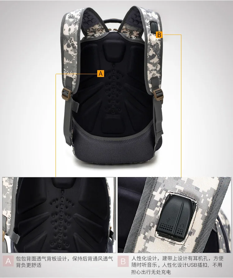 45л походные сумки для активного отдыха, походов, водонепроницаемый рюкзак для ноутбука, тактический военный тренировочный рюкзак, USB рюкзак для охоты и рыбалкиХарактеристика:1. Ткань: 600D Оксфорд.2. 40 л, водонепроницаемый, анти-износ, многослойный, может размещать предметы в слоях.3. Размер: 55*31*14 см.4. Вес: 1,0 кг5. Подходит для тактических, наружных и спортивных занятий.6. Маркировка: USB6. Маркировка: USB