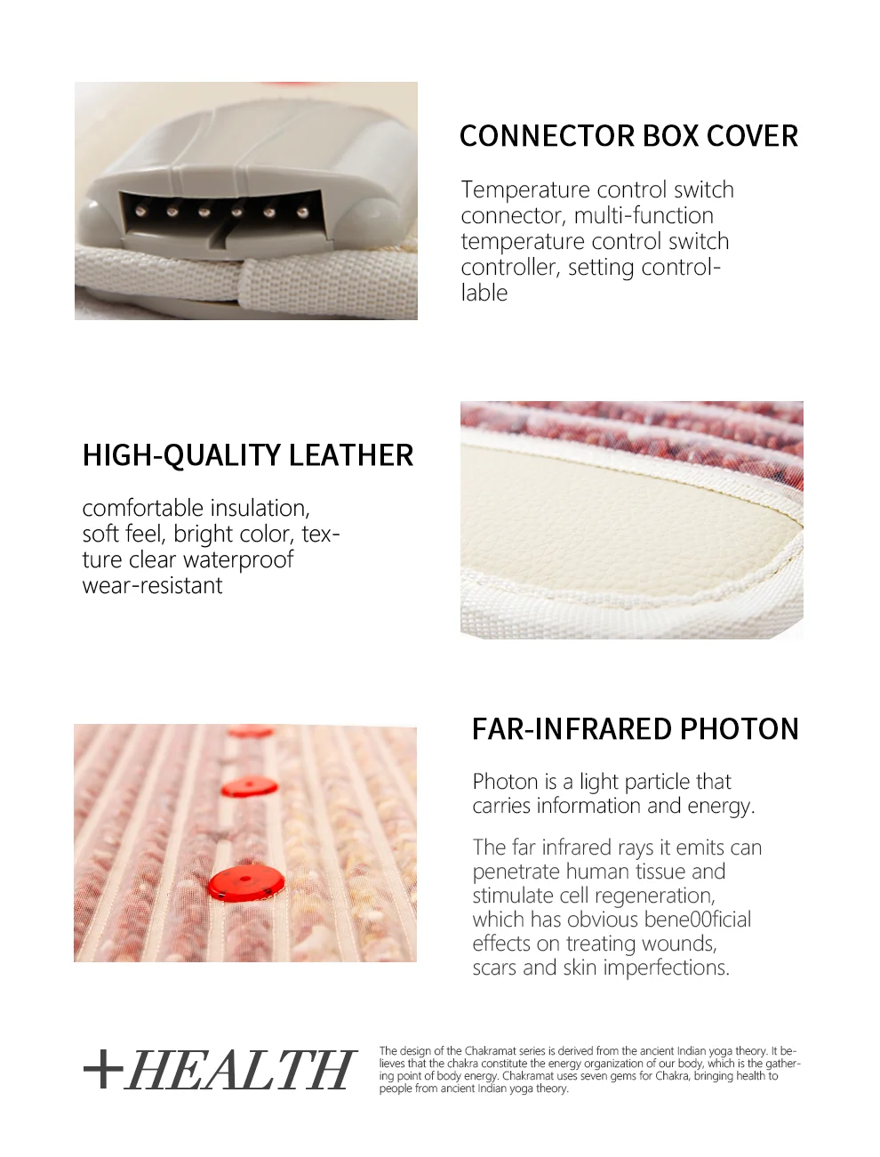 Chakramat E2500 thermal therapy combines the most advanced technology with ancient Oriental medicine. It is our assurance and commitment for people health. This thermal therapy combines the advantages of seven gemstone and photon that brings you health in many ways.