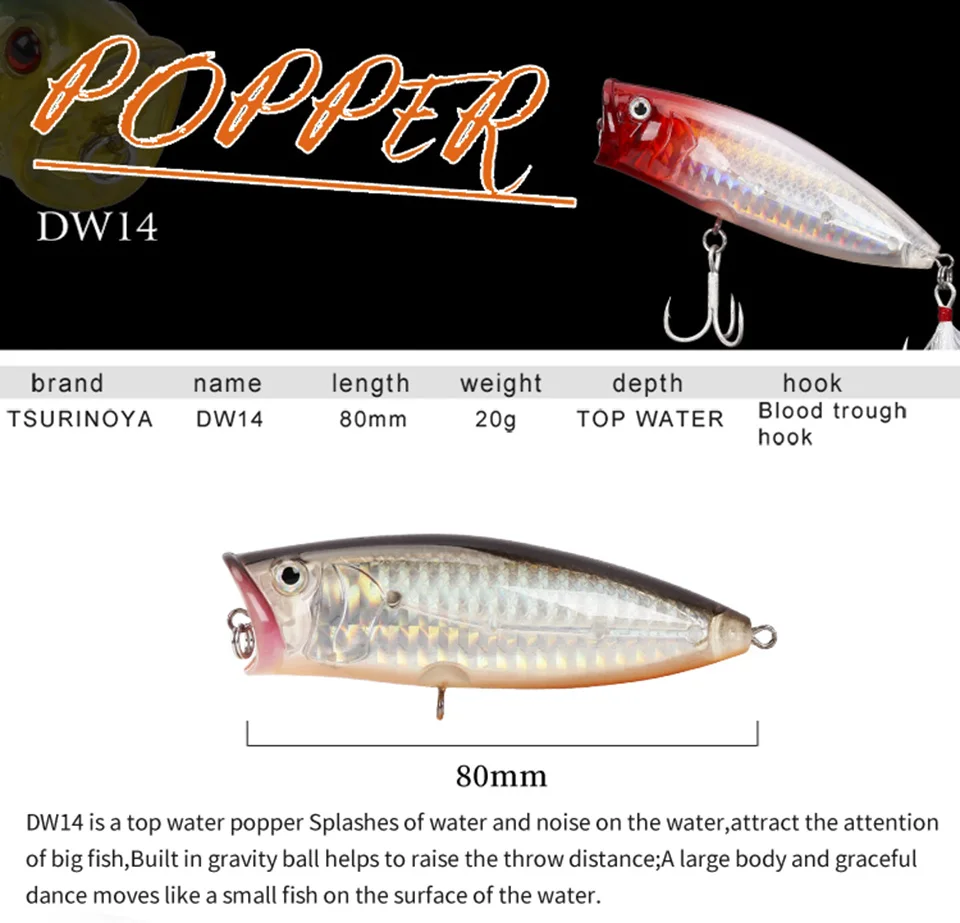 Модель: DW14 Тип: встроенный в транспортное средство Длина: 80 мм Вес: 20g Количество: 1 шт Поппер Описание 1. Тело имеет сдвигаемый шар фокуса, когда сбрасывается может двигаться к хвосту, улучшает расстояние сбрасывания. Стабильная и гладкая воздушная осанка, не легко вращается в пользу демпинга. 2. Новое покрытие, лазерная планка рыбьей чешуи на поверхности может быть всей точкой отражения внешнего светильник, он имеет отличный светильник, эффект приманки рыбы. Подходит для различных режимов. 3. Есть несколько небольших зерен в vivo ball, при этом тащить будет звучать, сильно привлекая внимание рыбы.
