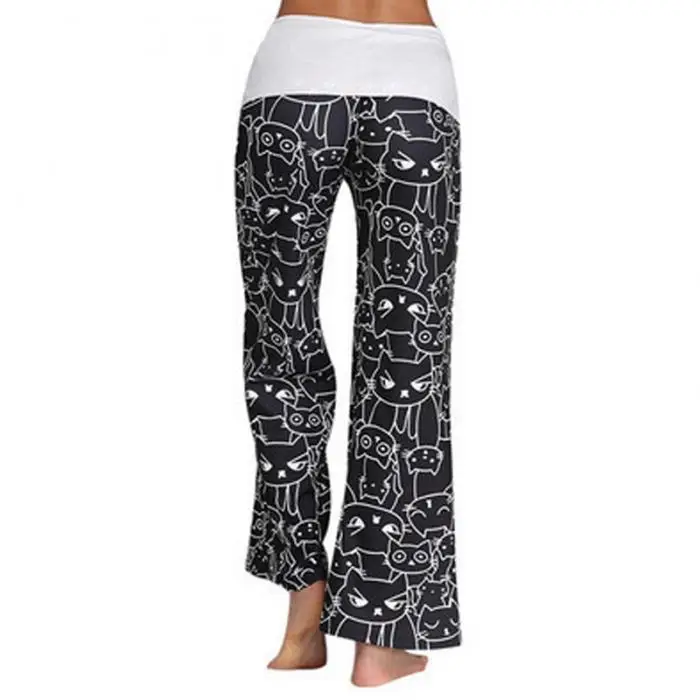 Hot Women Mid Waist Cat Print Wide Leg Long Yoga Pants Elastic Drawstring Leggings MCK99