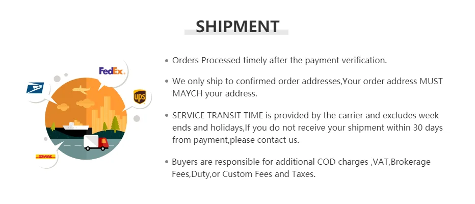 5. Экспресс-Доставка (DHL,Fedex,UPS,TNT и т. Д.) и почтовое обслуживание предоставляются для доставки. 3-7 дней будет доставлен к вам через экспресс-доставку