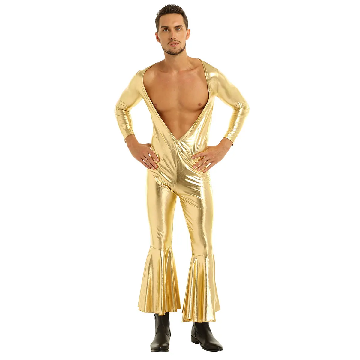 Длинные рукава, Глубокий v-образный вырез горловины и Открытая грудь, с расклешенными штанинами снизу колокольчика, глянцевый внешний вид и Приталенный покрой.
