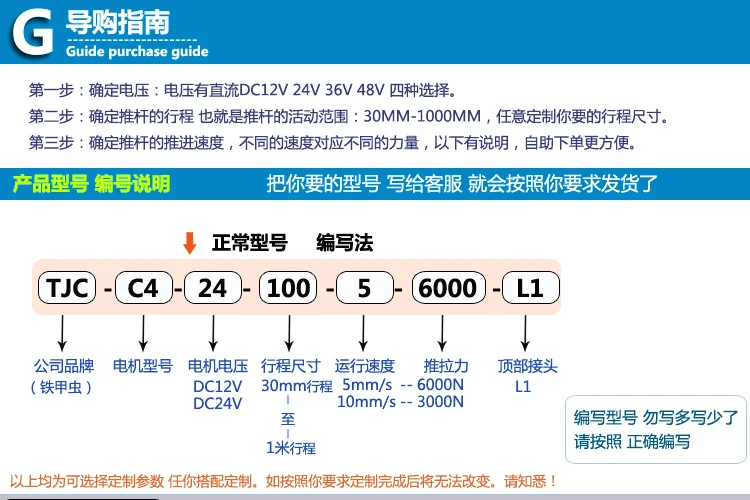 Инструкции по использованию и меры предосторожности: 1. Двигатель толкателя не может работать непрерывно в течение длительного времени. Рабочая скорость толкателя20%Непрерывная работа2Минуты, отдых8Минута. 2.Двигатель толкателя имеет встроенный концевой выключатель, который автоматически останавливается в конце/до конца (к головке/усадке до конца), и останавливается, когда любая мощность выключена в середине. 3. Ход двигателя толкателя не регулируется, и завод был установлен. Толкатель не является водонепроницаемым. 4. После выбора скорости толкателя скорость двигателя толкателя может быть скорректирована путем регулировки напряжения, а напряжение, скорость и тяга могут быть уменьшены. 5. Обратите внимание, что одновременно используются несколько толкателей. Из-за допусков на внутренние шестерни, роторы двигателя и другие аксессуары скорость примерно одинаковая.