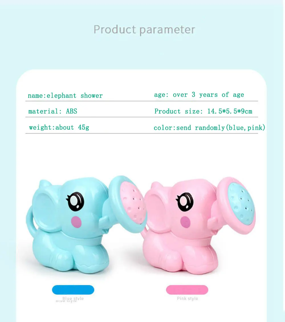 product faction: name:classical toys style:toys for baby kids itme:bath toys size:14.5*5.5*9cm color:send random color Features: 1. Cute elephant shape to attract your baby's attention. 2. Safe material, use with confidence. 3. Round and smooth, do not hurt your hands. 4. Integrated design, not easy to open and prevent damage 5. When taking a bath, let Mom and Dad easily bathe the baby.