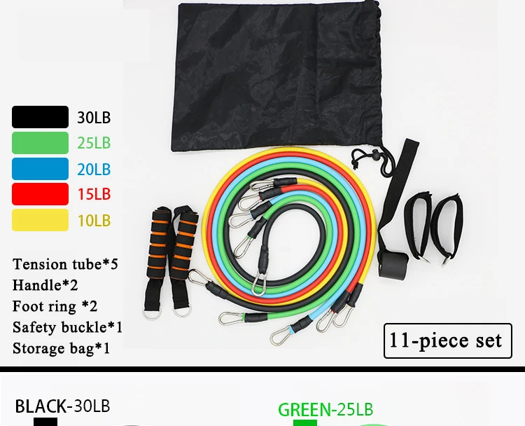 Benefits of Using Resistance Bands Suitable for yoga,fitness,exercise and other sports. Specifcation: Yellow:10 LB Red:15LB Blue:20LB Green:25LB Black:30LB Package Content: 5pcs resistance bands 1pcs door anchor 1pcs carrying bag 2 pcs foam covered handles 2pcs ankle straps