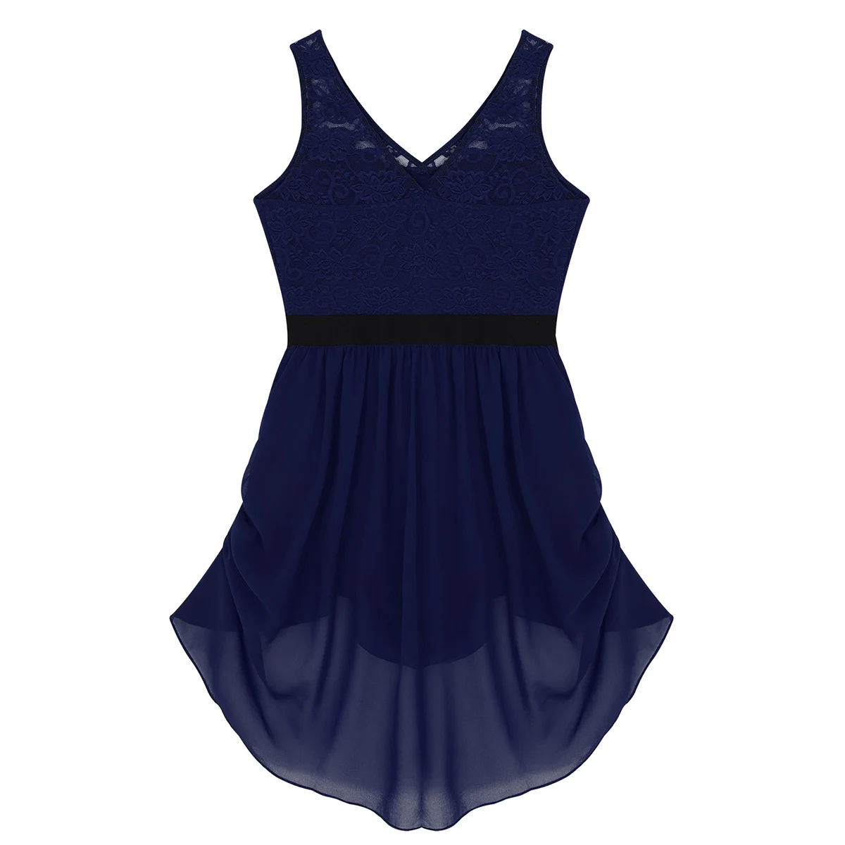 V-образный вырез и без рукавов, кружевной лиф с цветочным рисунком, черный эластичный ремень на талии, украшенный блестящей цветочной булавкой.
