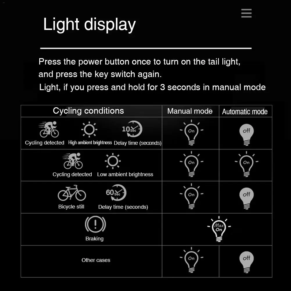 1. Интеллектуальный Индукционный тормоз: при обнаружении тормоза свет транспортного средства подсвечивается в течение 5 секунд, входит в медленно мигающий режим, и он статичен в течение 10 секунд. Он автоматически гаснет и не потеряет мощность.2,24 часов работы от аккумулятора, с 500 мАч большой емкости батареи более длительный срок службы батареи3. USB удобная зарядка: Мобильная мощность, зарядка мобильного телефона, можно заряжать в любое время, в любом месте.4. IPX6 Водонепроницаемый уровень, готов быть в режиме ожидания, больше не беспокойтесь о грязи независимо от любого вида погоды.5. Резьба разборка, удобно заряжать в любое время, резьбовой фиксированный способ, удобно для ежедневной зарядки и загрузки, легко разбирается.6,180 ° Расширенная поверхность освещения: поверхностная световая полоса в сочетании с технологией зеркала для достижения 180 ° азимута освещения.7. Компактный и легкий, весом всего около 56 г, легко носить с собой.1 * Руководство пользователя