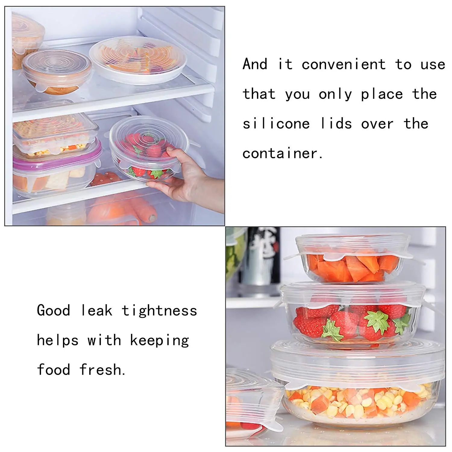 Все крышки легко растягиваются для различных форм и размеров контейнеров, гибкие для круглых, квадратных, прямоугольных или подходящих чаш, посуды, кастрюль, кружек, чашек и банок.