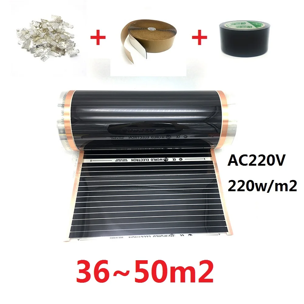 Package includes: 36m2 heating film: 72pcs x clamps, 7.2m x insulation paste, 1 roll x duct tape (15m) 37m2 heating film: 74pcs x clamps, 7.4m x insulation paste, 1 roll x duct tape (15m) 38m2 heating film: 76pcs x clamps, 7.6m x insulation paste, 1 roll x duct tape (15m) 39m2 heating film: 78pcs x clamps, 7.8m x insulation paste, 1 roll x duct tape (15m) 40m2 heating film: 80pcs x clamps, 8m x insulation paste, 2 rolls x duct tape (15m) 41m2 heating film: 82pcs x clamps, 8.2m x insulation paste, 2 rolls x duct tape(15m) 42m2 heating film: 84pcs x clamps, 8.4m x insulation paste,2 rolls x duct tape(15m) 43m2 heating film: 86pcs x clamps, 8.6m x insulation paste,2 rolls x duct tape(15m) 44m2 heating film: 88pcs x clamps, 8.8m x insulation paste,2 rolls x duct tape(15m) 45m2 heating film: 90pcs x clamps, 9m x insulation paste,2 rolls x duct tape(15m) 46m2 heating film: 92pcs x clamps, 9.2m x insulation paste,2 rolls x duct tape(15m) 47m2 heating film: 94pcs x clamps, 9.4m x insulation paste,2 rolls x duct tape(15m) 48m2 heating film: 96pcs x clamps, 9.6m x insulation paste,2 rolls x duct tape(15m) 49m2 heating film: 98pcs x clamps, 9.8m x insulation paste,2 rolls x duct tape(15m) 50m2 heating film: 100pcs x clamps, 10m x insulation paste,2 rolls x duct tape(15m)