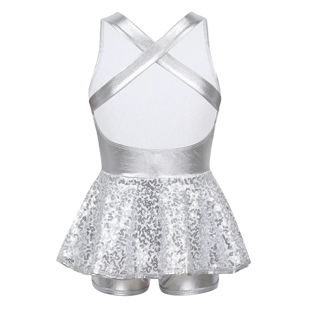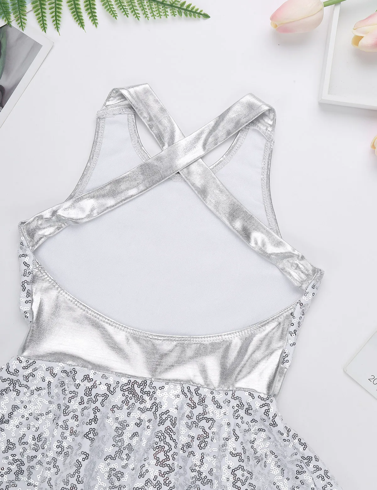 Dance leotard dress is made of polyester and sequins material, hand wash..