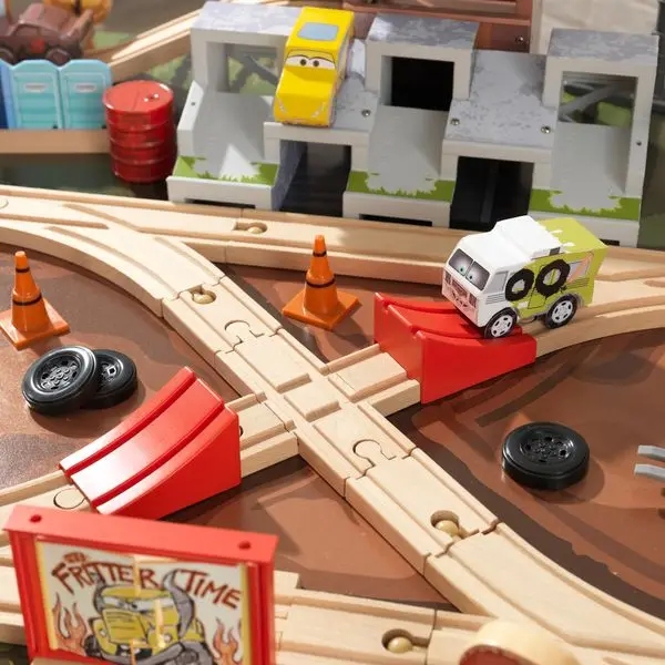 Игровой набор полностью разукрашен и стилизован в стиле ретро 50-е годы. Очень большой и красивый. Внутри паркинга гараж. Заезд и выезд с парковки происходит по внешнему спиральному треку. На территории парковки находится бензозаправка.