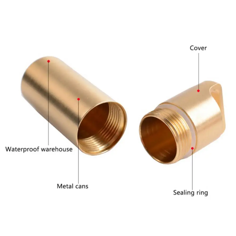 1、Premium Material: Made of solid brass, and the surface is finely polished.2、Healthy and Safety: Non-polluting. Great way to carry your medication safely and secure.3、Waterproof: O-ring increases the sealing performance to keep it 100% waterproof.4、Easy to Open: Finely milled threads give it the smoothest open and close, easy to open; keychain friendly.5、Product Size: Big height - 2.5 inches/63mm, inner diameter - 0.75 inches/19mm, weight - 1.8 ounce,mid height - 1.8 inches/46mm, inner diameter - 0.6 inches/15mm, weight -1 ounce, small height - 1.5 inches/38mm, inner diameter - 0.4 inches/11mm, weight - 0.5 ounce.Features:It is made of high quality brass rod CNC CNC wire cutting,compact thread and screws on securely.They are indestructible, super tough and ultra-light weight.They can be used to store all kinds of your personal belongings and keep them waterproof and secure.Such as hearing aid batteries, earplug, first aid pills, vitamins, toothpick, money, cash, coin, flint stone and so on.You can use them for emergency survival kits, hiking, camping or every day carry.Specification:Material: H62 brassSize:Big height - 2.5 inches/63mm, inner diameter - 0.75 inches/19mm, weight - 1.8 ounceMID height - 1.8 inches/46mm, inner diameter - 0.6 inches/15mm, weight -1 ounceSmall height - 1.5 inches/38mm, inner diameter - 0.4 inches/11mm, weight - 0.5 ouncePacking List: 3*waterproof containers
