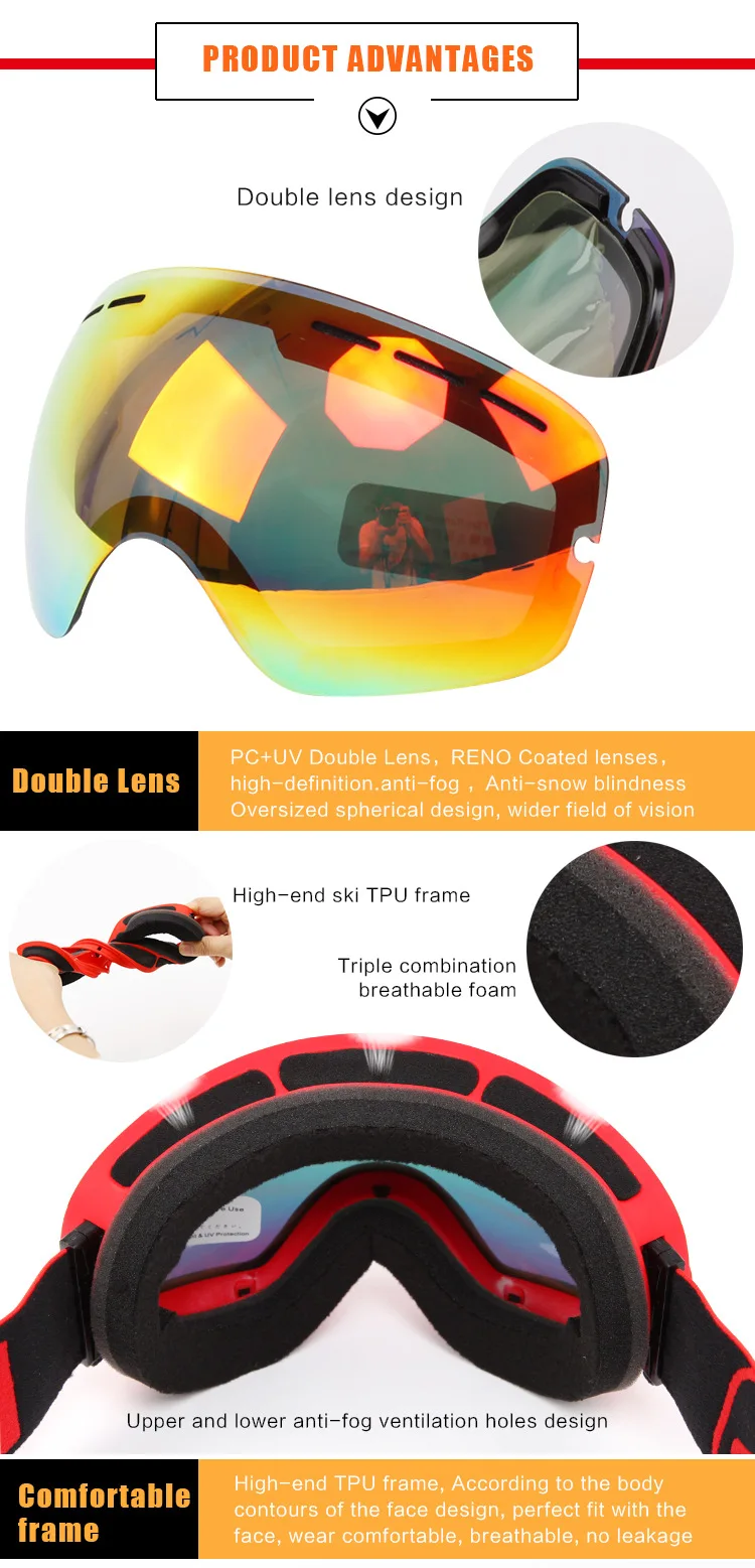 Высокая стоимость исполнения Высокое качество ТПУ Рамка с лучшей ударопрочностью и трехслойной пеной для комфортного ношения. Совместим со шлемом и подходит для различных зимних видов спорта: катания на лыжах, сноуборде, снегоходах и т. Д.