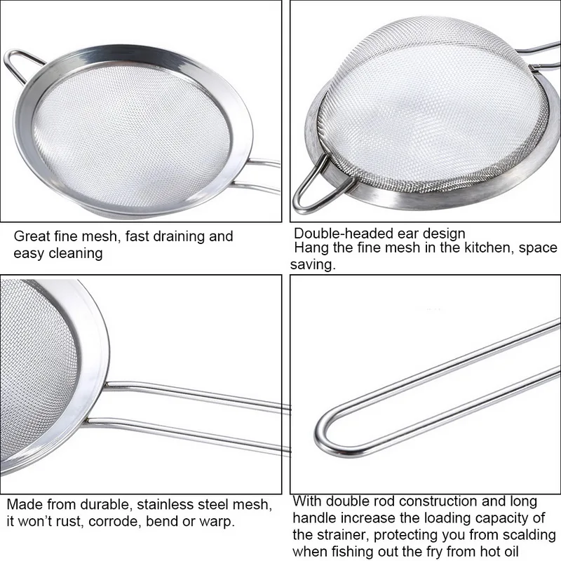 4. отличная тонкая сетка, быстрое сливание и легкая чистка: плетение обода сети способствует дополнительным мелким сетчатым отверстиям, что делает слив пищи быстрым и обеспечивает максимальное сохранение мелких частиц, эффективно экономит время уборки и больше никаких отходов пищи.