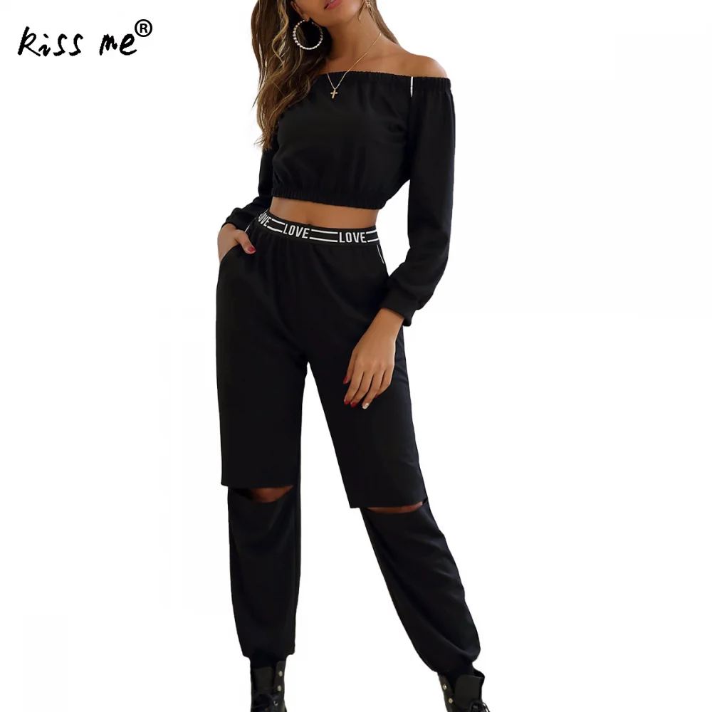 Черный женский спортивный костюм с открытыми плечами, спортивная одежда для бега, до колена, с вырезами, штаны, укороченный топ с высокой талией, женский тренировочный костюм