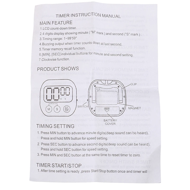 Очень прост в использовании: Нажмите кнопку S или M для установки секунд или минуты; Нажмите кнопку ST/SP для запуска/остановки таймера; нажмите кнопку M + S, чтобы 00:00.