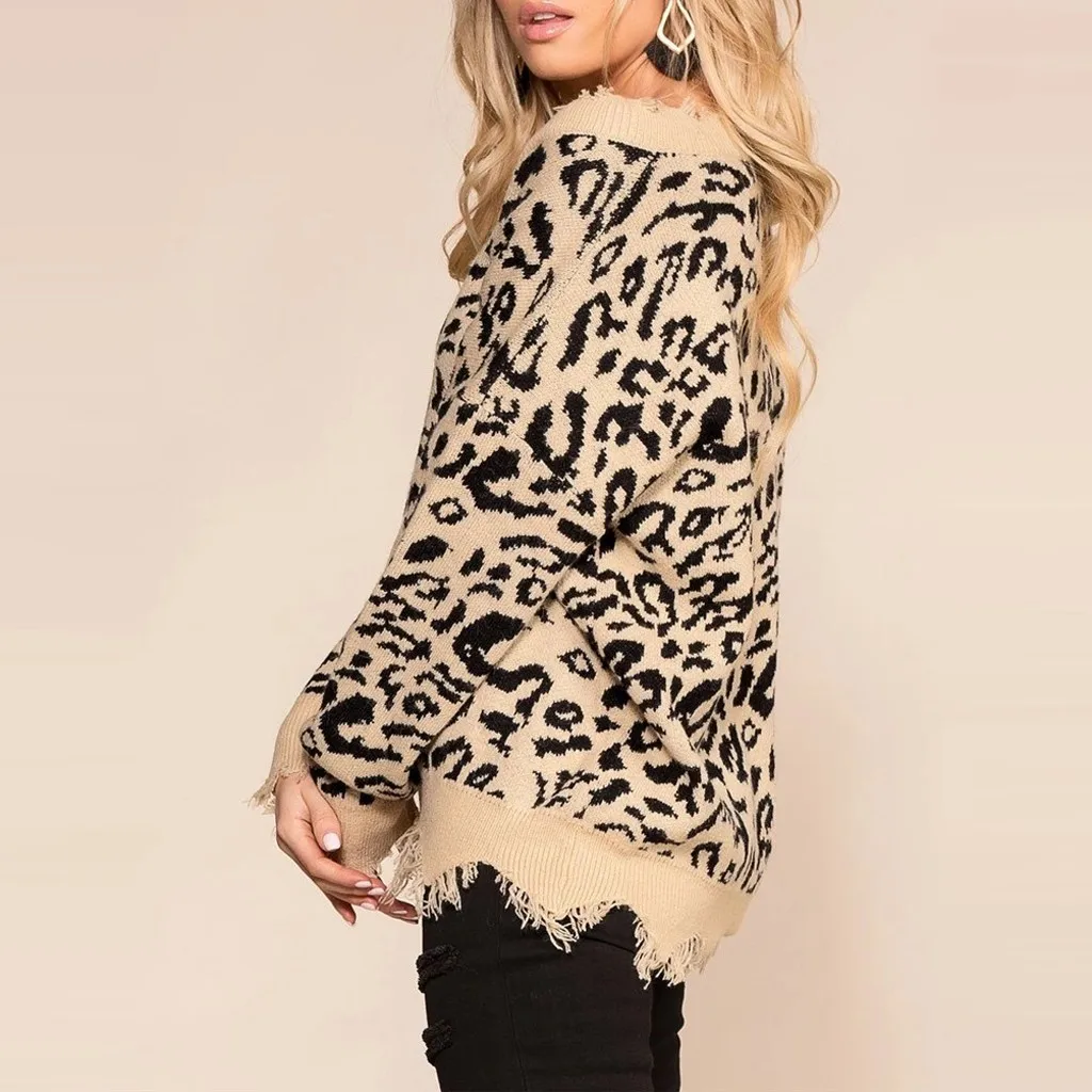 Характеристики: Стильный пуловер с леопардовым принтом, спущенными плечами, трикотажный джемпер с длинными рукавами, повседневный потертый свитер с v-образным вырезом