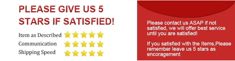 1. Please leave 5 star feedback if you're satisfied with our products and service, we will appreciate it (Item as Described 5 stars, Communication 5 stars, Shipping time 5-stars).