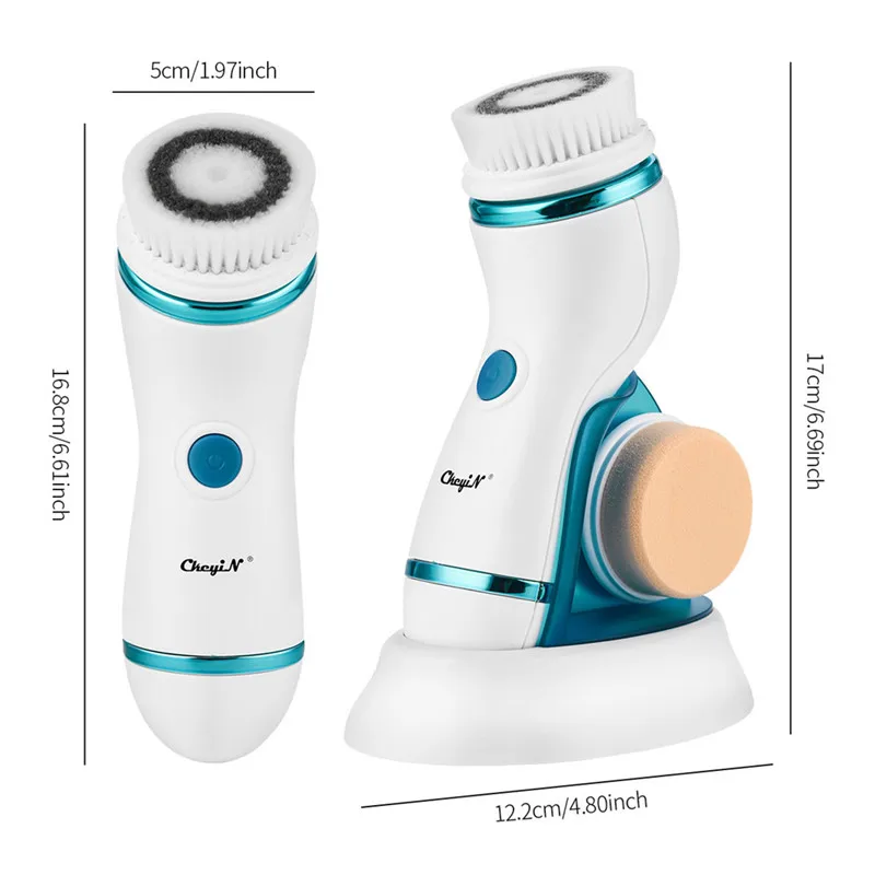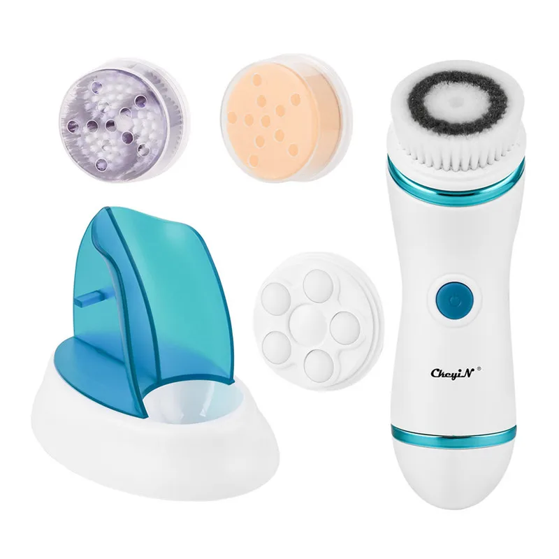 4 in 1 USB Rechargeable Electric Facial Cleansing Brush Massager Pore Face Cleaning Device Skin Care Brush Blackhead RemoverFeature:【High-Quality Material】Medical-grade silicone brush and soft brush bristle offer exquisite and comfortable using. 【2 Gears】2 vibration gears controlled by single [On/Off] button for varied cleaning needs and different skin types. 【4 In 1 Design】Purchase this one, you get a face cleaning brush, a roller massager, a makeup remover brush and a exfoliating brush. 【Users Friendly Design】4 detachable heads for various skin care needs, one button control for instant using. 【Charging Base Design】Charging base design helps you get rid of the messy cable lines for more organized using experience. 【Easy Storage】With a base for device holding, these 4 replaceable heads can also be stored in the base, providing supreme convenience and space-saving using. 【Portable & Stylish】Designed in the handy size, the facial cleanser is suitable for both daily home use and travel use. 4 Replaceable Heads:Face brush head: clean face, remove makeup, dirt, oil and more. Exfoliating brush head: for more thorough face cleaning, activate skin muscle and remove dead skin. Rolling massage head: promote blood circulation, invigorate facial muscle and smoothie skin. Soft sponge head: for makeup removal. Specification:Material: ABS Power supply: USB Voltage: 5V Power: 2.5W Gear: 2 Using time: Approx. 130 minutes Charging time: Approx. 2 hours Charging indicator: red light on while charging, green light on when fully charged Item size: 16.8x5cm Package content:1 x main device 1 x face brush head 1 x rolling massage head 1 x makeup remover head 1 x exfoliating head 1 x base 1 x USB 1 x users manual