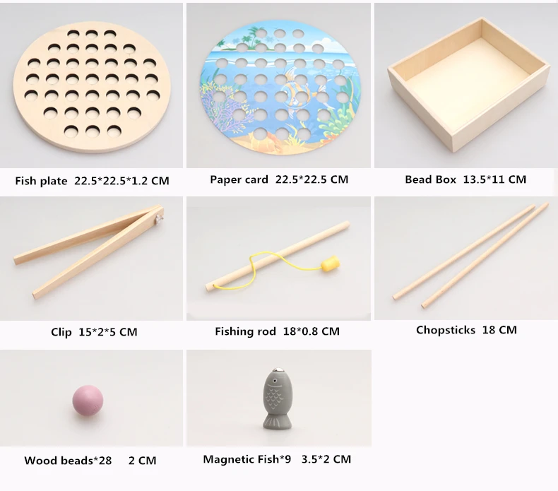 Название продукта: клубника зажим бусины Рыбалка Возраст: для детей от 3-х лет Размеры: 24*23,5*6,5 см (как на картинке) Вес: 0,65 кг Материал: высококачественная древесина + водяная краска Вспомогательное оборудование: 1. Рыба * 10 шт. 2. Клубника * 20 шт 3. Зажим * 1 шт. 4. Палочки для еды * 1 шт. 5. Удочка * 1 шт 6. Маленькая миска * 1 шт. 7. Базовая плата * 1 шт.