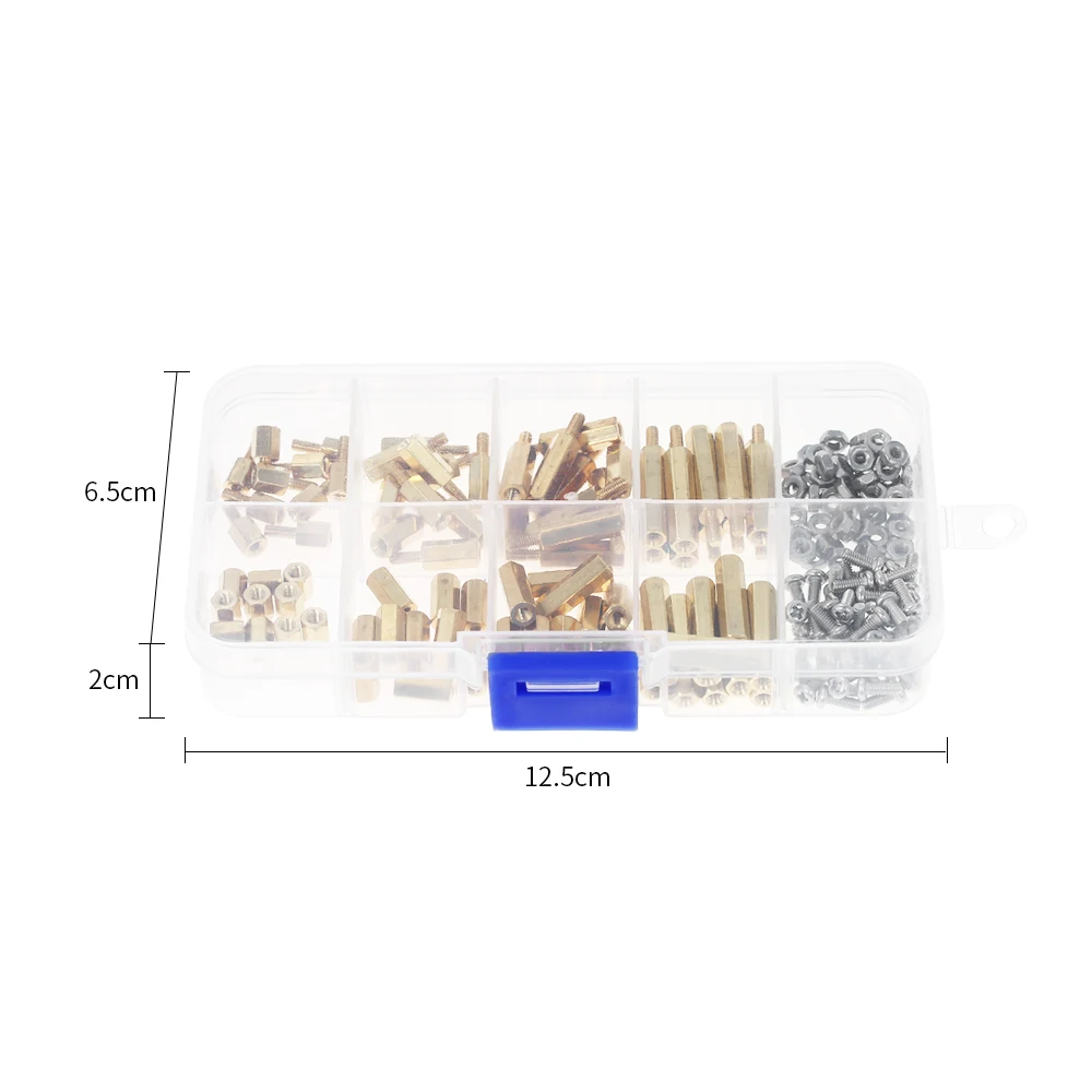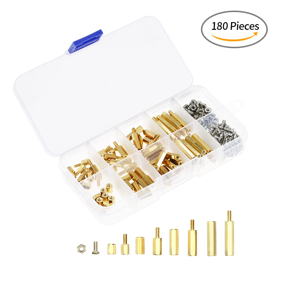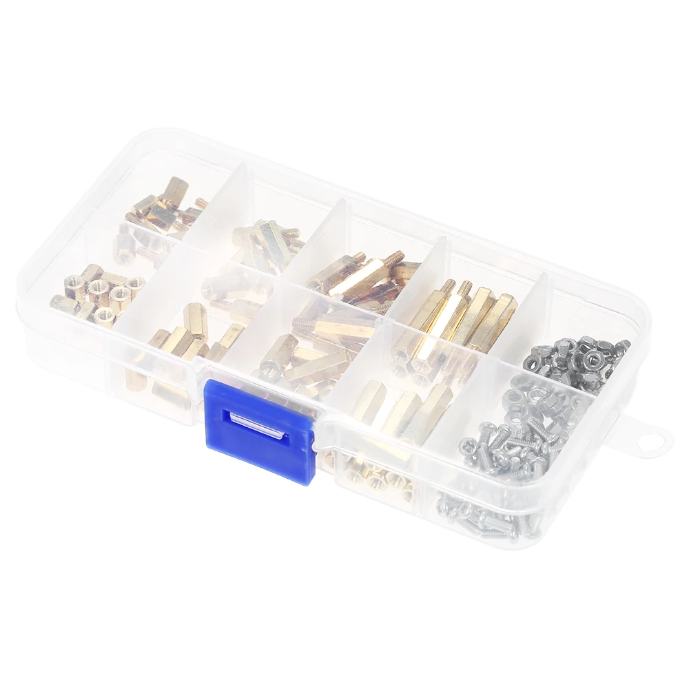Ассортимент поставляется с шестигранными прокладками, винтами, гайками, противостоянием, широкий выбор деталей подходит практически для любых применений. Прозрачная пластиковая разделенная коробка очень удобна для переноски.